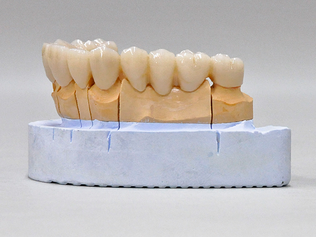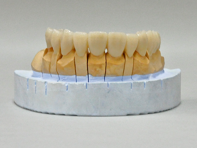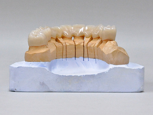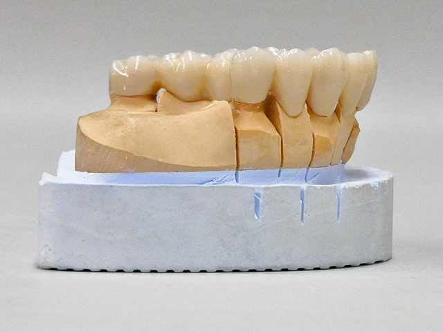Kerr社の製品で、主にハイブリッドレジン、コンポジット系のレジンの補強材として用いられているコンストラクトキットを使用して上顎のサンプルを試作してみました。従来のハイブリッドレジンの築盛に入る前に分離剤を塗布後、帯状のリボンを支台歯の内面に圧接してポンチィック部分にはファイバーコア用のバーを転用して強度維持の為に連結しました。ハイブリッドレジンによるメタルフリー型の補綴物であります。